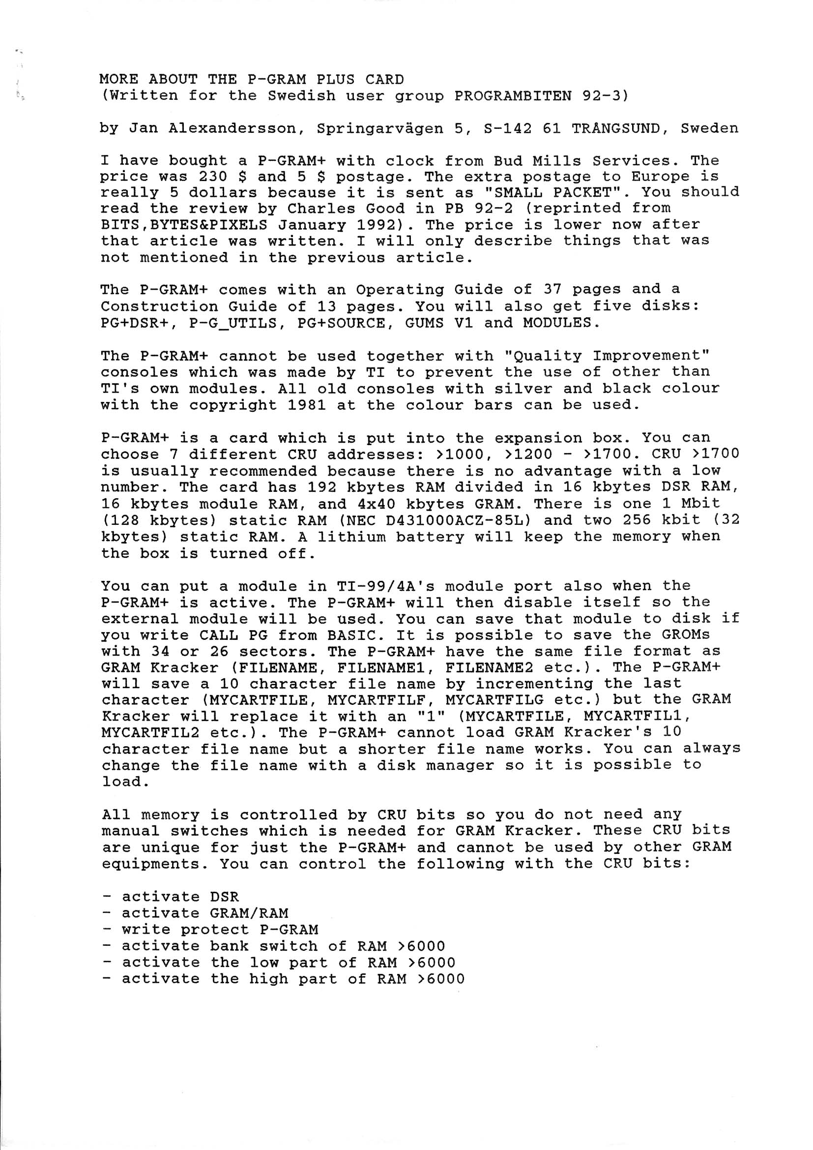 More on the PGRAM Plus Card by Jan Alexandersson |