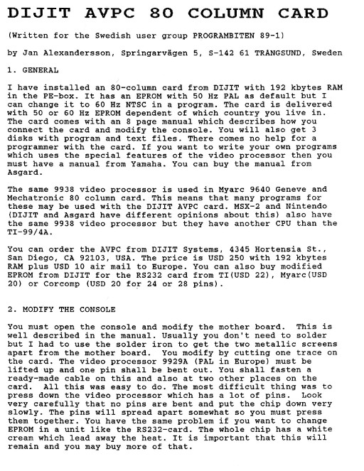 Review of the DIJIT AVPC 80 Column Card by Jan Alexandersson |