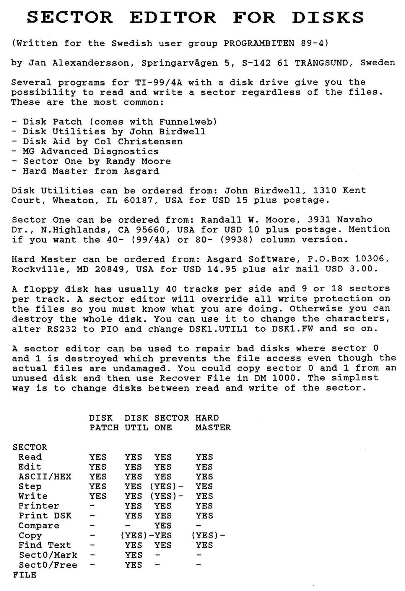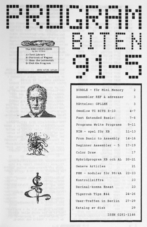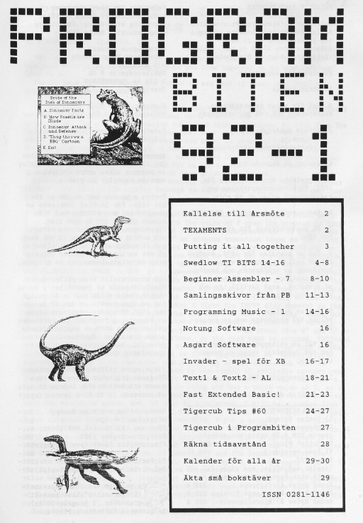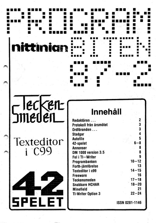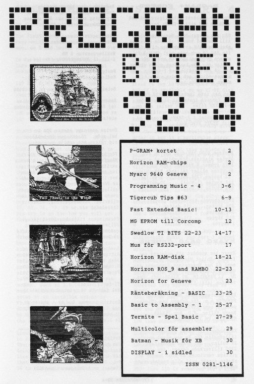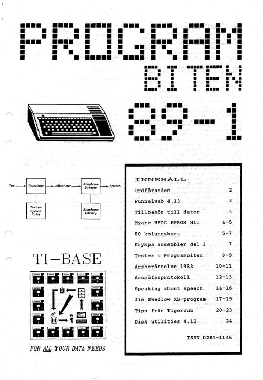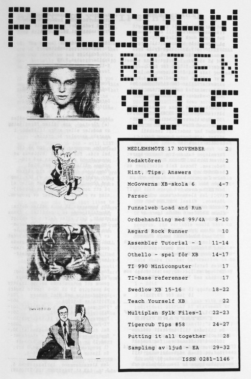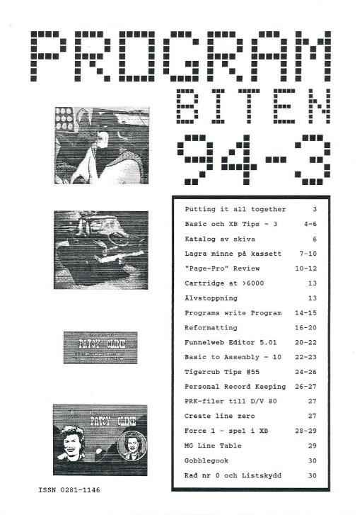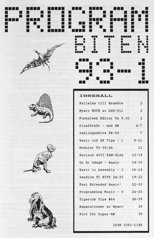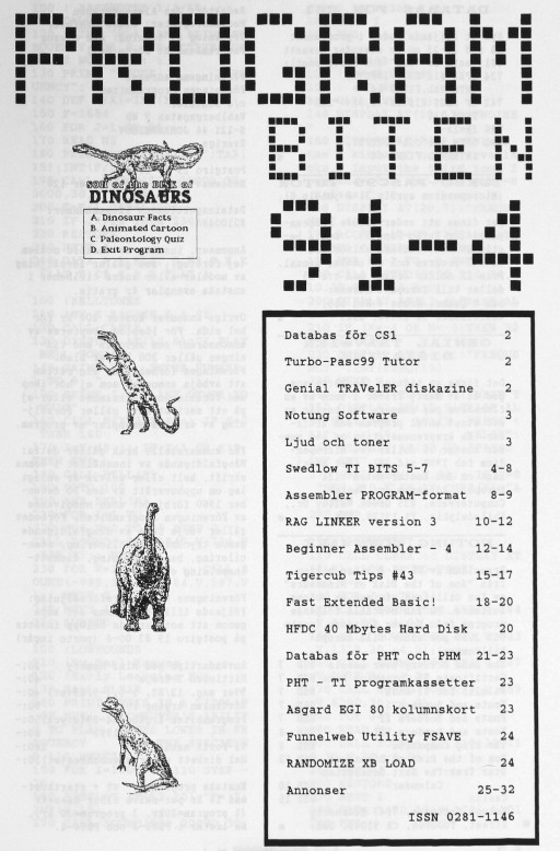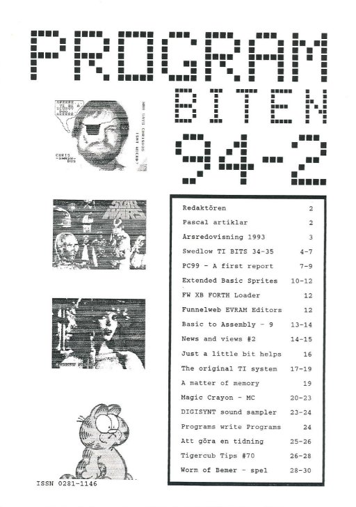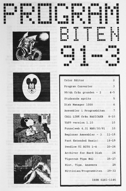 2 Color Editor 3 Program Converter 4 99/4A från grunden - 2 5 Studsande sprite 6 Disk Manager 1000 7 Assembler i Programbiten 8 CALL LINK från BASIC & XB 10 YAPP version 1.10 Funnelweb 4.31 MAR/30/91 11 Beginner Assembler - 3 18 Fast Extended Basic! 20 Swedlow TI BITS 1-4 24 Archiver for Hard Disk 25 Tigercub Tips #42 28 Hint, Tips, Answers 29 Nittinian/Programbiten |