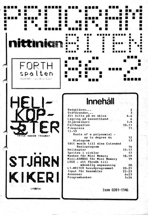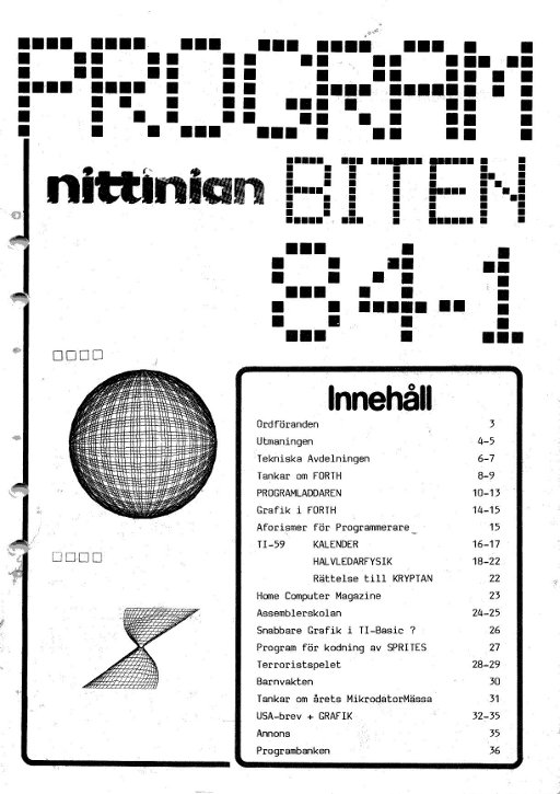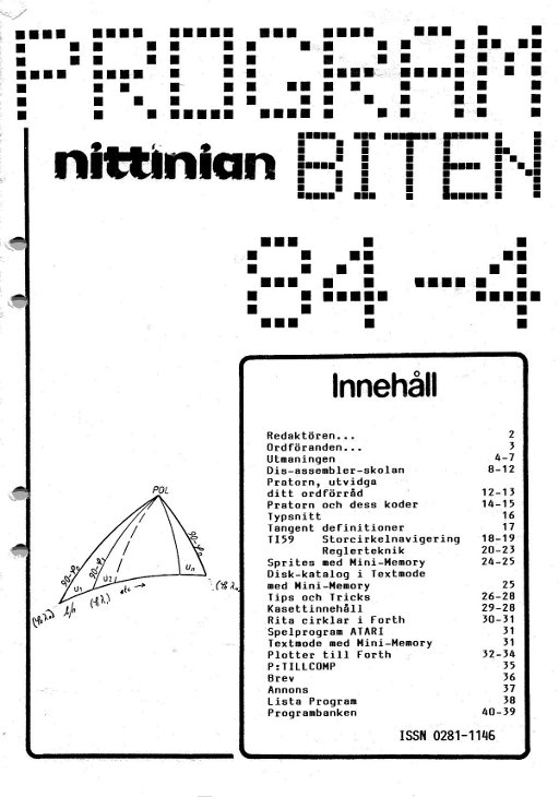 PROGRAMBITEN NITTINIAN 1984 nr 1 3 Ordföranden 4 Utmaningen 6 Tekniska Avdelningen 8 Tankar om FORTH 10 PROGRAMLADDAREN 14 Grafik i FORTH 15 Aforismer för Programmerare 16 TI-59 KALENDER; HALVLEDARFYSIK 23 Home Computer Magazine 24 Assemblerskolan 26 Snabbare Grafik i TI-Basic? 27 Program för kodning av SPRITES 29 Trroristspelet 30 Barnvakten 31 Tankar om årets MikrodatorMässa 32 USA-brev + GRAFIK 35 Annons 36 Programbanken |