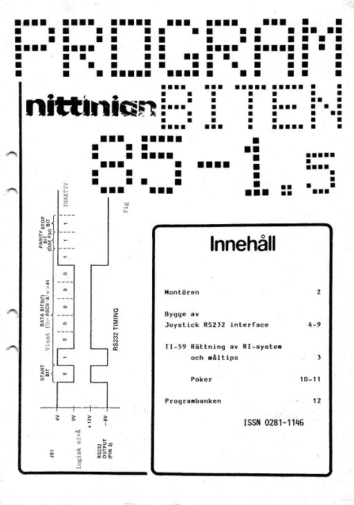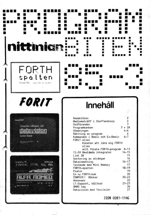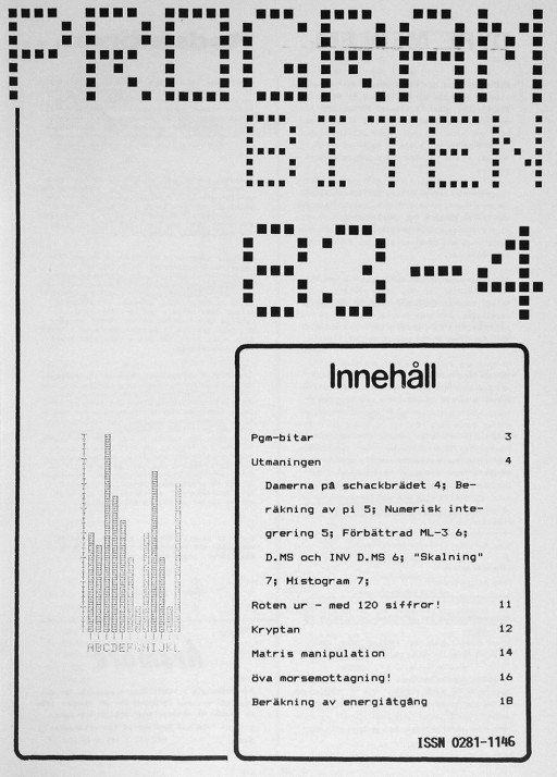 Programbiten 1983 nr 4 3 Pgm-bitar 4 Utmaningen Damerna på schakbrädet 5 Beräkning av pi Numerisk integrering 6 Förbättrad ML-3 D.MS och INV D.MS 7 "Skalning" Histogram 11 Roten ur - med 120 siffror! 12 Kryptan 14 Matris manipulation 16 Öva morsemottagning! 18 Bräkning av energiåtgång |