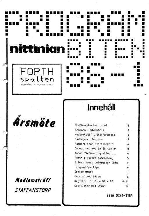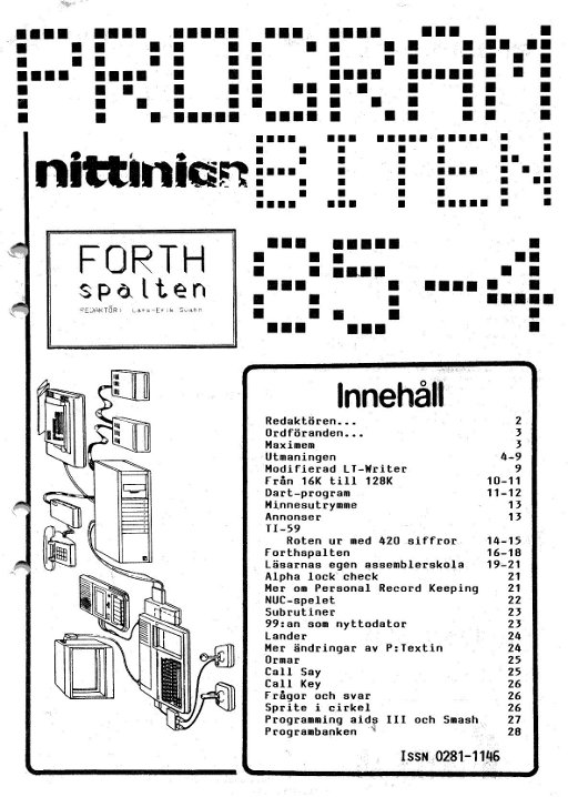 NITTINIAN 1983 nr 4 3 Ordföranden har ordet 4 Insänt 5 Årsmötesprotokoll 6 Utmaningen! 7 FORTH; Tillbehör till 99:an 8 Nummersändare 9 Joystickadapter 10 Allt om disk-drivar 12 Ett nytt äventyrsspel 14 Rapport PCW-mässan i London; Hangman 16 Parsec 18 Ordlista till Tunnels of Doom 20 Sortering 21 Mer om Multiplan och kalkylprogram 22 Lästips 24 Programmeringstekniker för Lotto 25 Jagad; Sammansatta ledtexter vid INPUT 26 Sifferjakt 28 Programbanken |