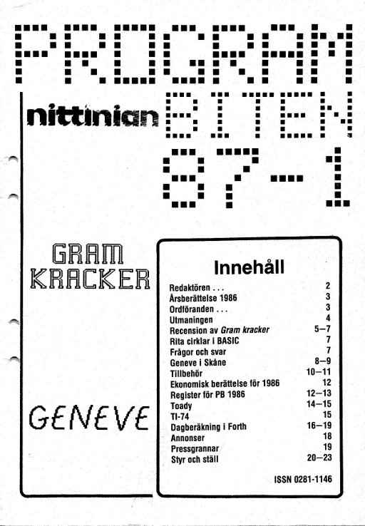 Programbiten Nittinian 1987 nr 1 2 Redaktören... 3 Årsberättelse 1986 Ordföranden... 4 Utmaningen 5 Recension av Gram kracker 7 Rita cirklar i BASIC Frågor och svar 8 Geneve i Skåne 10 Tillbehör 12 Ekonomisk berättelse för 1986 12 Register för PB 1986 14 Toady 15 TI-74 16 Dagsberäkning i Forth 18 Annonser 19 Pressgrannar 20 Styr och ställ |