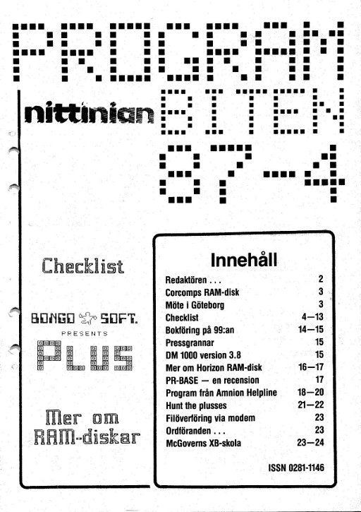 Programbiten Nittinian 1987 nr 4 2 Redaktören... 3 Corcomps RAM-disk Möte i Göteborg 4 Checklist 14 Bokföring på 99:an 15 Pressgrannar DM 1000 version 3.8 16 Mer om Horizon RAM-disk 17 PR-BASE - en recension 18 Program från Amnion Helpline 21 Hunt the plusses 23 Filöverföring via modem Ordföranden... McGoverns XB-skola |