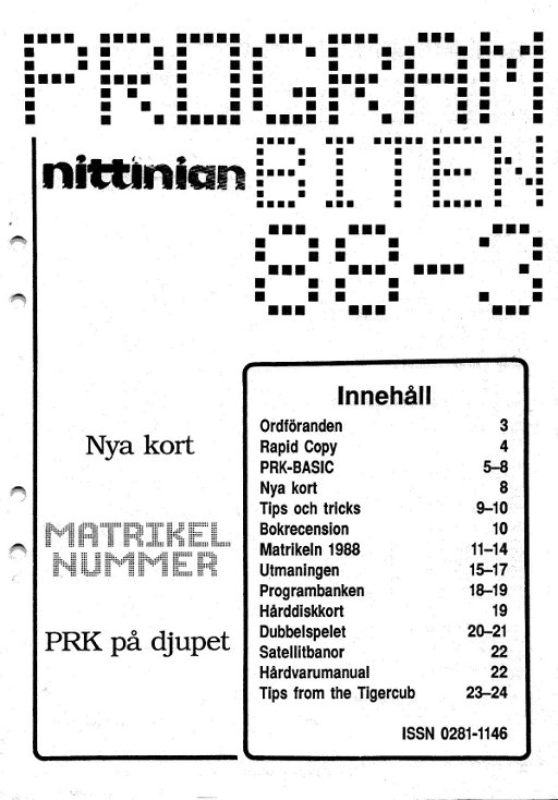 Programbiten Nittinian 1988 nr 3 3 Ordföranden 4 Rapid Copy 5 PRK-BASIC 8 Nya kort 9 Tips och tricks 10 Bokrecension 11 Matrikeln 1988 15 Utmaningen 18 Programbanken 19 Hårddiskkort 20 Dubbelspelet 22 Satellitebanor Hårdvarumanual 23 Tips from the Tigercub |