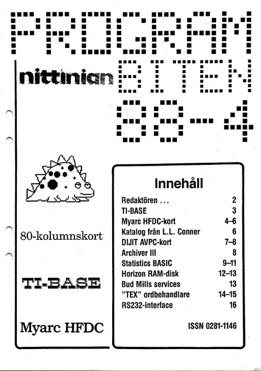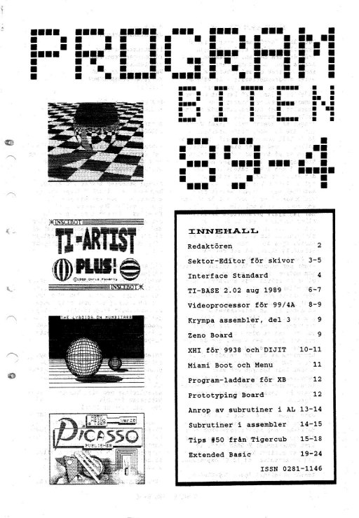 Programbiten Nittinian 1989 nr 4 2 Redaktören 3 Sektor-Editor för skivor 4 Interface Standard 6 TI-BASE 2.02 aug 1989 8 Videoprocessor för 99/4A 9 Krympa assembler, del 3 Zeno Board 10 XHI för 9938 och DIJIT 11 Miami Boot och Menu 12 Program-laddare för XB Prototyping Board 13 Anrop ab subrutiner i AL 14 Subrutiner i assembler 15 Tips #50 från Tigercub 19 Extended Basic |