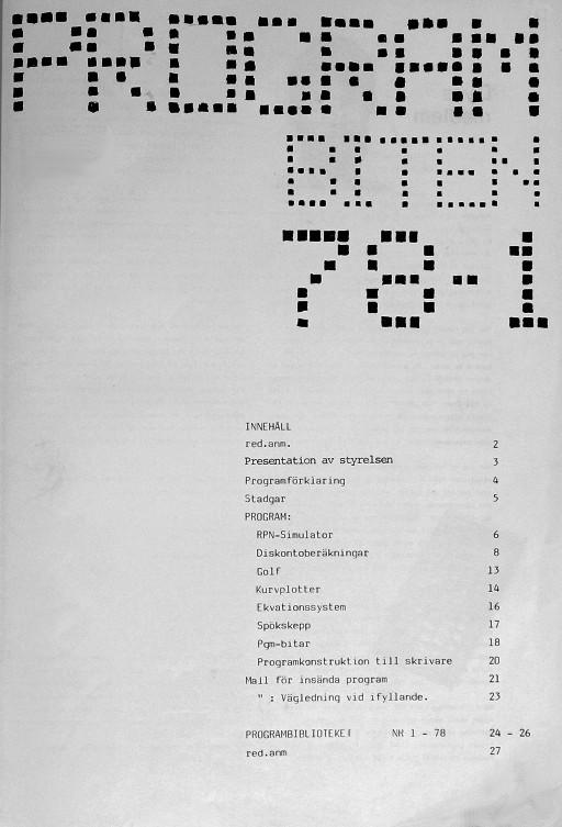 Programbiten 1978 nr 1 2 red.anm. 3 Presentation av styrelsen 4 Programförklaring 5 Stadgar 6 RPM-Simulator 8 Diskontoberäkningar 13 Golf 14 Kurvplotter 16 Ekvationssytem 17 Spökskepp 18 Pgm-bitar 20 Programkonstruktion till skrivare 21 Mall för insända program 23 '' : Vägledning vid ifyllande. 24 PROGRAMBIBLIOTEKET 27 red.anm. |