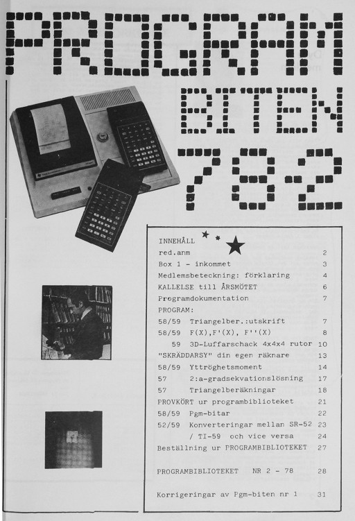 Programbiten 1979 nr 1 2 red.anm. 3 Box 1 - inkommet 5 RPN-simulator II (TI-58/59) 8 Medlemsinformation 9 Årsberättelse Protokoll från årsmötet 11 Medlemsannonser Svar till medlemssynpunkter 12 Nim - spelprogram (TI-59) 16 Blankettraseri - om dokumentation 19 Flaggtest (TI-58/59) 20 Pgm-bitar (SR-52, TI-58/59) 24 Ekvationslösningar (TI-57, TI-58/59) 26 Ränteomvandling (TI-58/59) 27 Utskriftstecken - koder (TI-58/59) 28 PROGRAMBIBLIOTEKET |