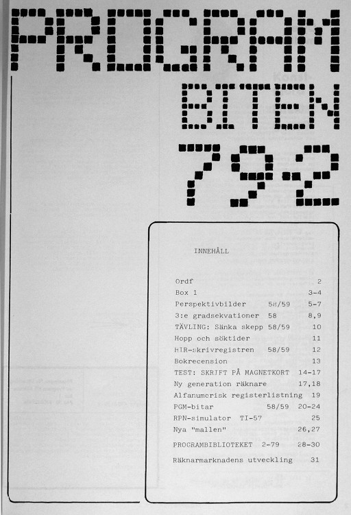 Programbiten 1979 nr 2 2 Ordf 3 Box 1 5 Perspektivbilder 58/59 8 3:e gradsekvationer 58 10 TÄVLING: Sänka skepp 58/59 11 Hopp och söktider 12 HIR-skrivregistren 58/59 13 Bokrecension 14 TEST: SKRIFT PÅ MAGNETKORT 17 Ny generation räknare 19 Alfanumerisk registerlistning 20 PGM-bitar 58/59 25 RPN-simulator TI-57 26 Nya "mallen" 28 PROGRAMBIBILIOTEKET 2-79 31 Räknarmarknadens utveckling |