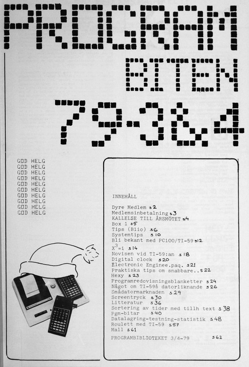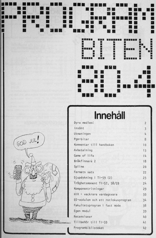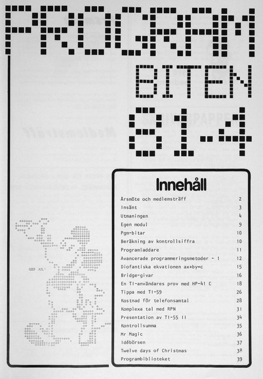 Programbiten 1981 nr 4 2 Årsmöte och medlemsträff 3 Insänt 4 Utmaningen 9 Egen modul 10 Pgm-bitar Beräkning av kontrollsiffra 11 Programladdare 12 Avancerade programmeringsmetoder - 1 15 Diofantiska ekvationen ax+by=c 16 Bridge-givar 18 En TI-användares prov med HP-41 C 26 Tippa med TI-59 28 Kostnad för telefonsamtal 31 Komplexa tal med RPN 34 Presentation av TI-55 II 35 Kontrollsumma 36 Mr Magic 37 Idébörsen 38 Twelve days of Christmas 39 Programbiblioteket |