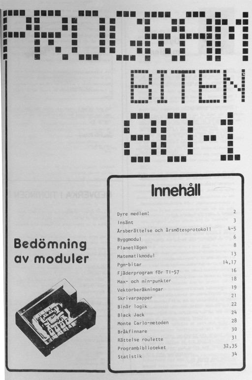 Programbiten 1980 nr 1 2 Dyre medlem! 3 Insänt 4 Årsberättelse och årsmötesprotokoll 6 Byggmodul 8 Planetlägen 13 Matematikmodul 14 Pgm-bitar 16 Fjäderprogram för TI-57 18 Max- och min-punkter 19 Vektorberäkningar 21 Skrivarpapper 22 Binär logik 24 Black Jack 28 Monte Carlo-metoden 30 Bråkfinnare 31 Rättelse roulette 32 Programbiblioteket 34 Statistik |