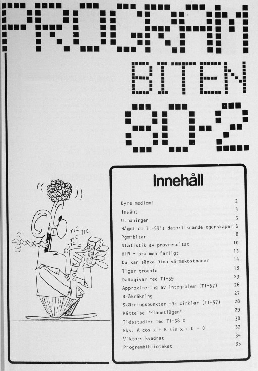 Programbiten 1980 nr 3 2 Dyre medlem 3 Insänt 4 Utmaningen 8 Programbitar 11 Lönar det sig att göra en subrutin? 12 Bråkräkning 13 Mer om HIR 14 Djupdykning i TI-59 16 Slumptal - generatorer och tester 20 Slumptal - ett annat test 21 Kalender TI-57 22 Periodiska systemet 24 Max och min TI-57 25 Om programskrivning 26 TI-57-listning på TI-59 28 RPN-modulen 30 Tjuv och polis 34 Alarm! (TI-59 som alarmklocka) 35 Programförmedling & -bibliotek |