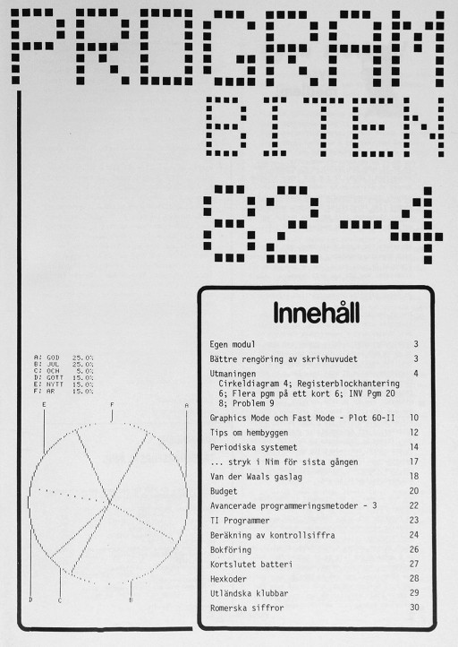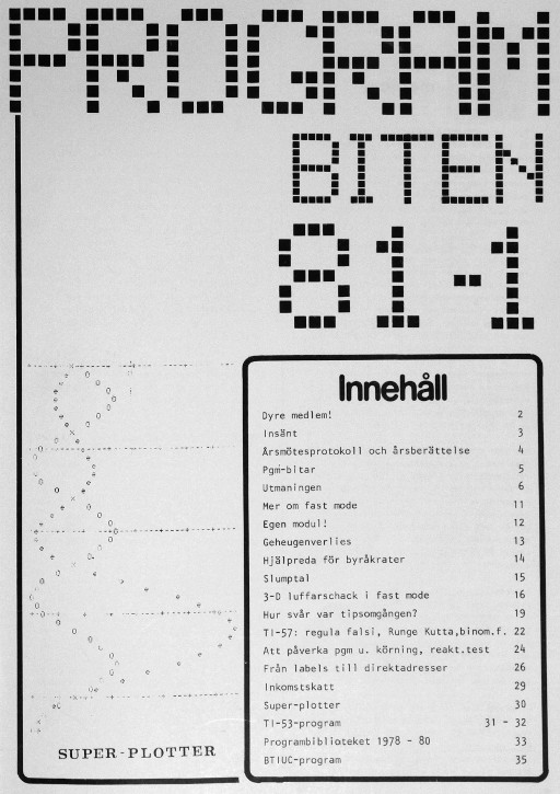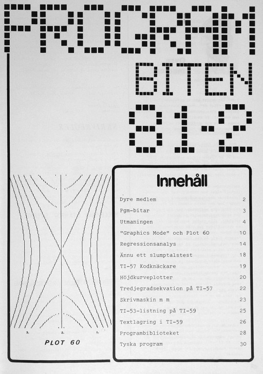Programbiten 1981 nr 2 2 Dyre medlem 3 Pgm-bitar 4 Utmaningen 10 "Graphics Mode" och Plot 60 14 Regressionsanalys 18 Ännu ett slumptalstest 19 TI-57 Kodknäckare 20 Höjdkurveplotter 22 Tredjegradsekvation på TI-57 23 Skrivmaskin m m 25 TI-53-listning på TI-59 26 Textlagring i TI-59 28 Programbiblioteket 30 Tyska program |
