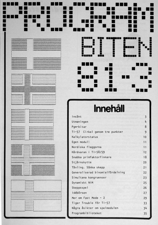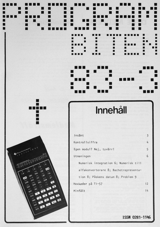 Programbiten 1983 nr 3 3 Insänt 4 Kontrollsiffra 5 Egen modul? Nej, tyvärr! 6 Utmaningen Numerisk integration 8 Numerisk till alfakonverterare Bachetrepresentation Påskens datum 9 Problem 12 Hexkoder på TI-57 14 Minfält |