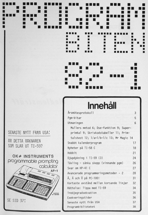 Programbiten 1982 nr 1 3 Årsmötesprotokoll 5 Pgm-bitar 6 Utmaningen Mullers method 9 Dse-funktionen Super-primtal 11 Skrivkodstabeller 12 Primtalstest 13 1/a+1/b=1/c 14 Mr Magic 17 Snabbt kalenderprogram 18 Nyheter på TI-58 C 21 Hobbit 24 Djupdykning i TI-59 (3) 26 Tävling - sänka skepp (vinnande pgm) 28 Avancerade programmeringsmetoder - 2 31 Å, Ä och Ö på PC-100! 32 Kortaste avstånd melland korsande linjer 34 Rättelse: Tippa med TI-59 35 Tredjegradsekvation 36 Exekveringstider 37 Senaste nytt från USA 38 Programbiblioteket |