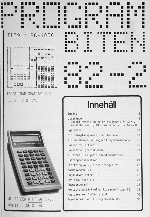 Programbiten 1982 nr 2 3 Insänt 4 Utmaningen Dubbel precision 6 Primtalstest 7 Skrivkodstabeller AOS-simulator 8 Problem 10 Pgm-bitar 13 Nio slumptalsgeneratorer testade 16 TIs misshandel av linjära kongruensmetoden Samköp av litteratur 17 Förbättrad grafisk mode 18 TI-99/4A - en jätte bland hemdatorer 21 Fjärdegradsekvation 22 Skattninge av pi, e och integraler 25 Närmevärden (2) 26 Höjdkurveplotter (2) 27 RPN-simulator III 28 "Rymdprogram" 32 Kortaste avstånd mella korsande linjer (2) 33 Kastbana med luftmotstånd 36 Premiärtest v TI Programmable 88 |