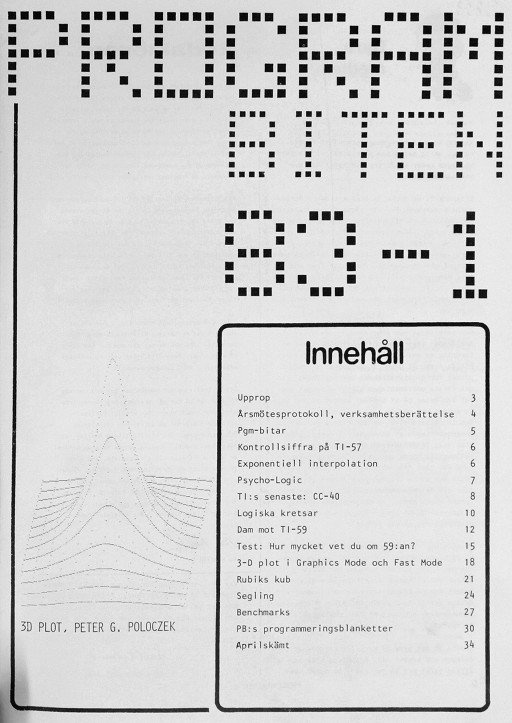 Programbiten 1983 nr 1 3 Upprop 4 Årsmötesprotokoll, verksamhetsberättelse 5 Pgm-bitar 6 Kontrollsiffra på TI-57 Exponentiell interpolation 7 Psycho-Logic 8 TI:s senaste: CC-40 10 Logiska kretsar 12 Dam mot TI-59 16 Test: Hur mycket vet du om 59:an? 18 3-D plot i Graphics Mode och Fast Mode 24 Segling 27 Benchmarks 30 PB:programmeringsblanketter 34 Aprilskämt |