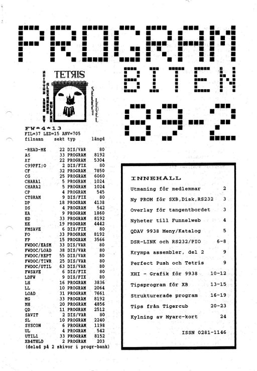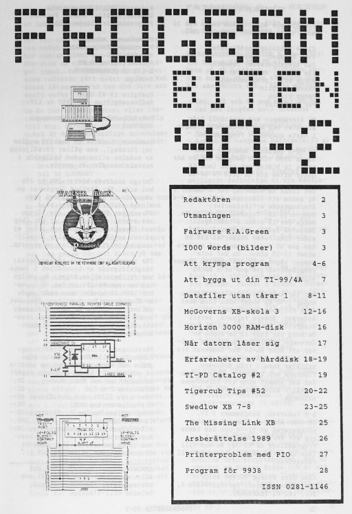 2 Redaktören 3 Utmaningen Fairware R.A.Green 1000 Words (bilder) 4 Att krympa program 7 Att bygga ut din TI-99/4A 8 Datafiler utan tårar 1 12 McGoverns XB-skolan 3 16 Horizon 3000 RAM-disk 17 När datorn låser sig 18 Erfarenheter av hårddisk 19 TI-PD Catalog #2 20 Tigercub Tips #52 23 Swedlow XB 7-8 25 The Missing Link XB 26 Årsberättelse 1989 27 Printerproblem med PIO 28 Program för 9938 |