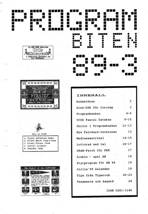 Programbiten Nittinian 1989 nr 3 2 Redaktören 3 Disk-DSR för Corcomp 4 Programbanken 8 UCSD Pascal Databas 11 Skivor i Programbanken 13 Nya Fairware-versioner 14 Medlemsmatrikel 16 Lottorad med tal 17 GRAM-Patch för PRK 18 Zombie - spel XB 19 Styrprogram för DM 99 Girlie'89 kalender 20 Tips från Tigercub 24 Texaments och Asgard |