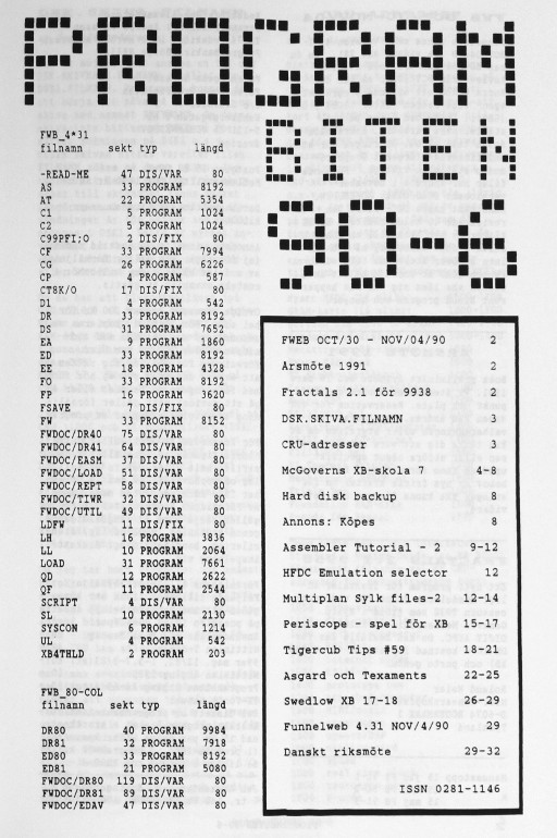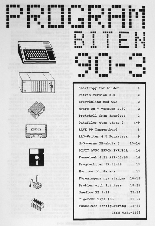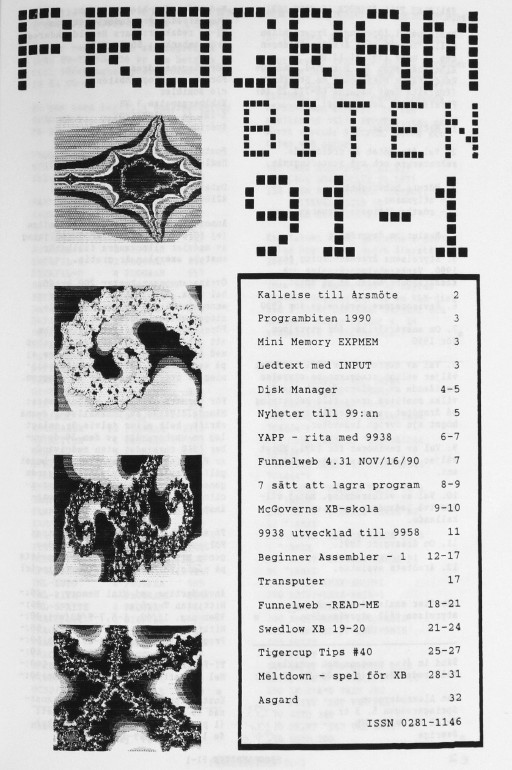 2 Kallelse till årsmöte 3 Programbiten 1990 Mini Memory EXPMEM Ledtext med INPUT 4 Disk Manager 5 Nyheter till 99:an 6 YAPP - rita med 9938 7 Funnelweb 4.31 NOV/16/90 8 7 sätt att lagra program 9 McGoverns XB-skola 11 9938 utecklad till 9958 12 Beginner Assembler - 1 17 Transputer 18 Funnelweb - READ-ME 21 Swedlow XB 19-20 25 Tigercup Tips #40 28 Meltdown - spel för XB 32 Asgard |