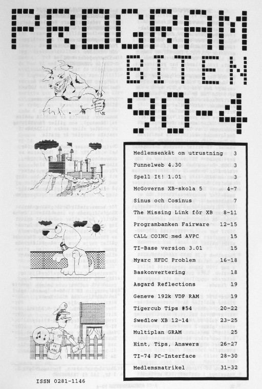 3 Medlemsenkät om utrustning Funnelweb 4.30 Spell It! 1.01 4 McGoverns XB-skola 5 7 Sinus och Cosinus 8 The Missing Link för XB 12 Programbanken Fairware 15 CALL COINC med AVPC TI-Base version 3.01 16 Myarc HFDC Problem 18 Baskonvertering 19 Asgard Reflections Geneve 192k VDP RAM 20 Tigercub Tips #54 23 Swedlow XB 12-14 25 Multiplan GRAM 26 Hint, Tips, Answers 28 TI-74 PC-Interface 31 Medlemsmatrikel |