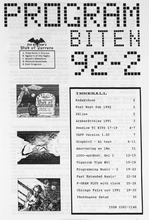 2 Redaktören Fest West feb 1992 Säljes 3 Årsberättelse 1991 4 Swedlow TI BITS 17-19 7 YAPP version 1.20 8 Graphic2 - AL text 11 Amortering av lån 12 LOGO-språket, del 1 15 Tigercub Tips #61 19 Programming Music - 2 22 Fast Extended Basic! 25 P-GRAM PLUS with clock 29 Chicago Faire nov 1991 30 Påskdagens datum |