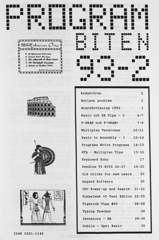 2 Redaktören Horizon problem 3 Årsredovisning 1992 4 Basic och XB Tips - 2 7 P-GRAM och P-GRAM+ 10 Multiplan Versioner 12 Basic to Assembly - 3 14 Programs Write Programs 15 HTA - Multiplan Tips 17 Keyboard Echo 18 Swedlow TI BITS 26-27 20 Old tricks for new users Asgard Software 21 CRU Power-up and Search 22 Funnelweb v5 Text Editor 26 Tigercub Tips #65 28 Typing Teacher 29 Inventory - XB 30 Goblin - Spel |