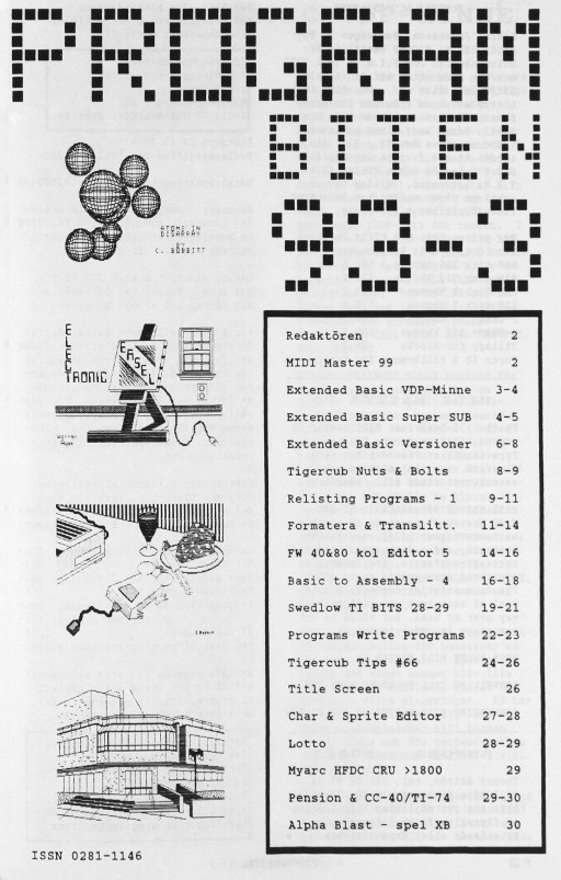 2 Redaktören MIDI Master 99 3 Extended Basic VDP-Minne 4 Extended Basic Super SUB 6 Extended Basic Versioner 8 Tigercub Nuts & Bolts 9 Relisting Programs - 1 11 Formatera & Translitt. 14 FW 40&80 kol Editor 5 16 Basic to Assembly - 4 19 Swedlow TI BITS 28-29 22 Programs Write Programs 24 Tigercub Tips #66 26 Title Screen 27 Char & Sprite Editor 28 Lotto 29 Myarc HFDC CRU >1800 Pension & CC-40/TI-74 30 Alpha Blast -spel XB |