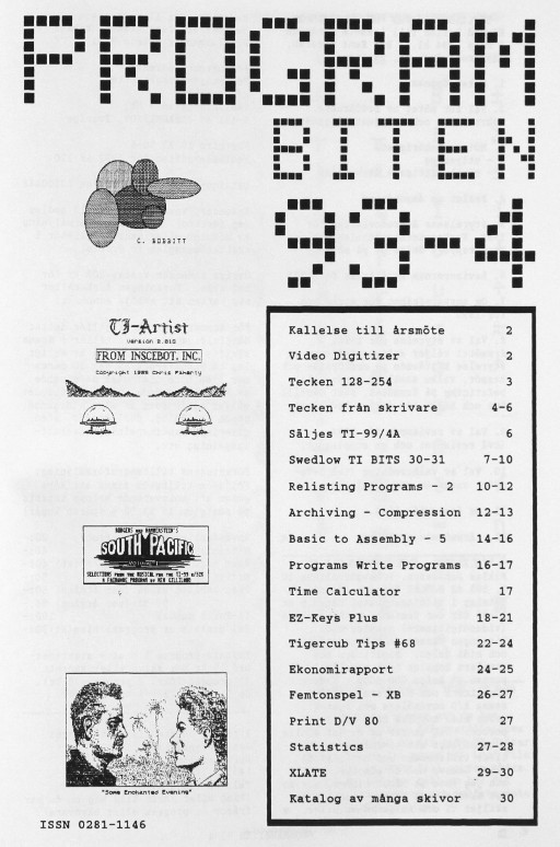2 Kallelse till årsmöte Video Digitizer 3 Tecken 128-254 4 Tecken från skrivare 6 Säljes TI-99/4A 7 Swedlow TI BITS 30-31 10 Relisting Programs - 2 12 Archiving - Compression 14 Basic to Assembly - 5 16 Programs Write Programs 17 Time Calculator 18 EZ-Keys Plus 22 Tigercub Tips #68 24 Ekonomirapport 26 Femtonspel - XB 27 Print D/V 80 Statistics 29 XLATE 30 Katalog av många skivor |