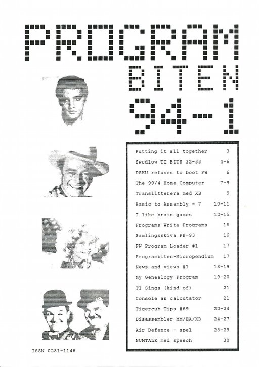 3 Putting it all together 4-6 Swedlow TI BITS 32-33 6 DSKU refuses to boot FW 7-9 The 99/4 Home Computer 9 Translitterera med XB 10-11 Basic to Assembly - 7 12-15 I like brain games 16 Programs Write Programs 16 Samlingsskiva PB-93 17 FW Program Loader #1 17 Programbiten-Micropendium 18-19 News and views #1 19-20 My Genealogy Program 21 TI Sings (kind of) 21 Console as calculator 22-24 Tigercub Tips #69 24-27 Disassembler MM/EA/XB 28-29 Air Defence - spel 30 NUMTALK med speech |
