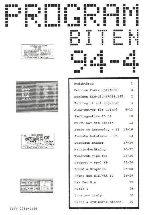 2 Redaktören Horizon Power-up(RAMBO) Horizon RAM-disk(ROS8.14F) 3 Putting it all together 4-12 ALEX-skivor för utland 12 Samlingsskiva PB 94 Multi-SAY med Speech 13 Basic to Assembly - 11 13 Svenska bokstäver - XB 17 Sveriges städer 20 Matris-beräkning 23 Tigercub Tips #56 25 Jackpot - spel XB 27 Sound & Graphics 28 Print doc DIS/VAR 80 29 Hex Dec Bin 29 Musik 1 30 Love you truly 30 Extra & ordinarie stämma |